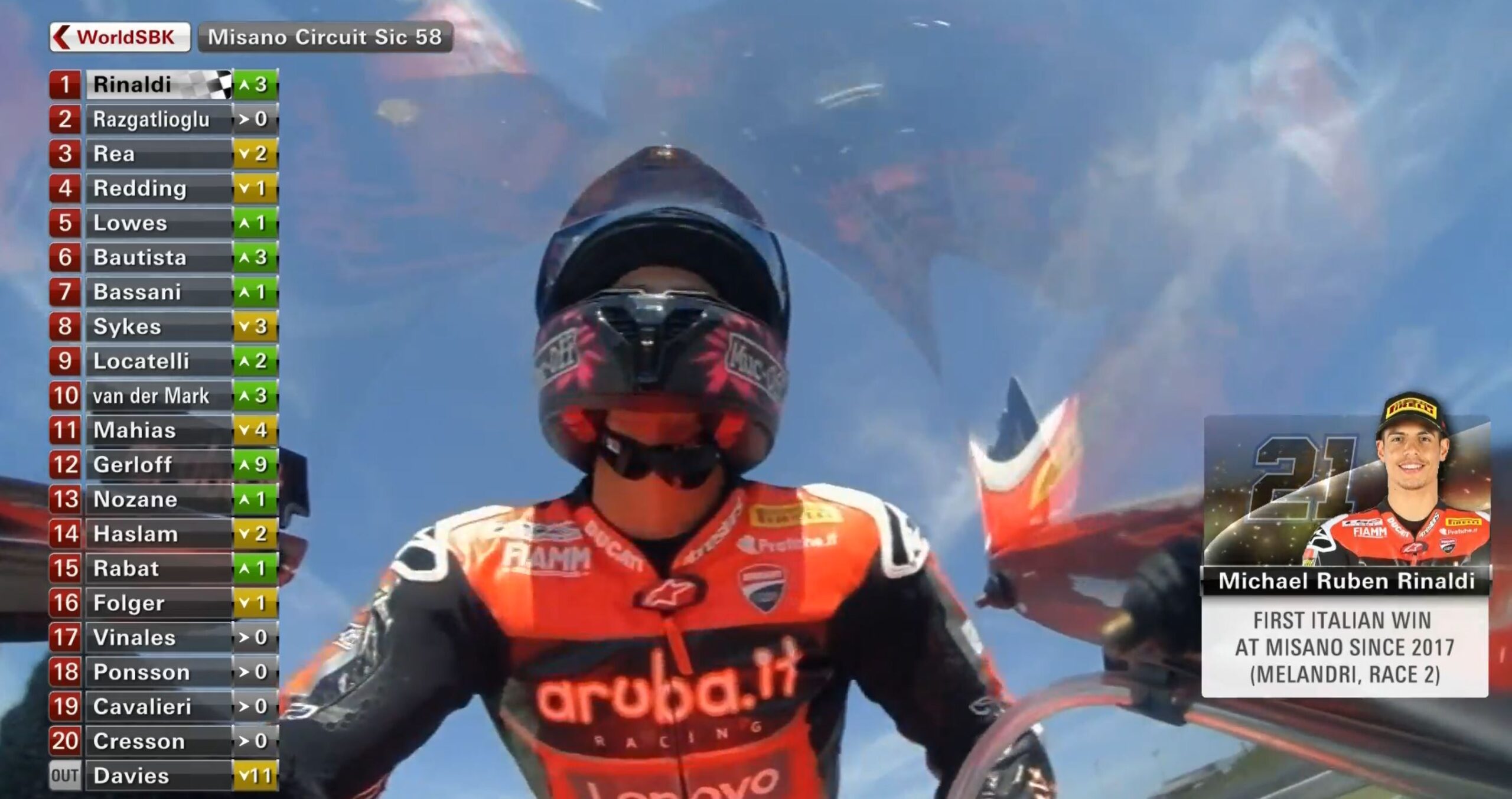 Tepat setelah lampu hijau dinyalakan tanda Balapan 1 di mulai, Michael Ruben Rinaldi (Aruba.it Racing – Ducati) yang memulai balapan dari posisi ke-4 secara agresif langsung melaju keposisi terdepan dan berhasil berada di posisi pertama dimulai tikungan ke-2 sampai dengan 21 putaran saat bendera finish dikibarkan. Dan tentu ini menjadikan balapan ini lebih spesial karena balapan WorldSBK kali ini di Misano World Circuit “Marco Simoncelli” sudah memperbolehkan kembali dihadiri oleh penonton di Tribun. Bahkan Rinaldi yang mengetahui bahwa jarak dengan posisi ke-2 aman, memulai selebrasi pada sector terakhir sebelum menyentuh garis finish. Rinaldi mulai melambaikan tangan sebentar kepada penonton dan selanjutnya melintasi garis finish. Ini benar-benar menjadi kemenangan sempurna karena di raih oleh Pembalap Italy dengan Motor Italy dan diselengarakan di sirkuit Italy. Bisa dikatakan kemenangan kali ini adalah Victory Made in Italy. Sekaligus ini menjadikan kemenangan Rinaldi pertama di Misano, dan menjadi pembalap Italy pertama yang dapat menang di sirkuit Misano sejak tahun 2017 yang sebelumnya diraih Marco Melandri pada Race-2.