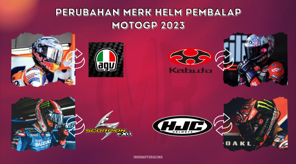 Pada tahun 2023 ini banyak pembalap yang berganti helm, dari merk sebelumya ke merk baru. Dan alasannya pun beragam terutama yang paling sering terjadi tentunya ketidaksesuaian saat negosiasi. Tentu saja selain helm penting bagi pembalap, bagi pabrikan helm juga penting untuk mendapatkan promosi dari pembalap apalagi jika pembalap tersebut berada didepan dan terus mendapatkan sorotan kamera, tentu hal ini menjadi sangat penting bagi pabrikan helm tersebut.