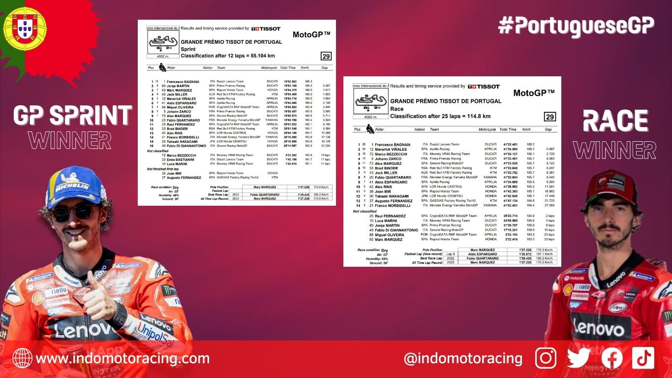 Juara dunia MotoGP 2022 benar-benar mengukuhkan keunggulannya dengan memenangi GP sprint ini dan dengan kesabaran yang dimilikinya terus membuntuti Jorge Martin dan akhirnya berhasil memanfaatkan celah yang ada dan berhasil menjadi yang tercepat. Pecco Bagnaia mengatakan bahwa sangat menikmati GP sprint yang baru pertama kali diselenggarakan ini.
