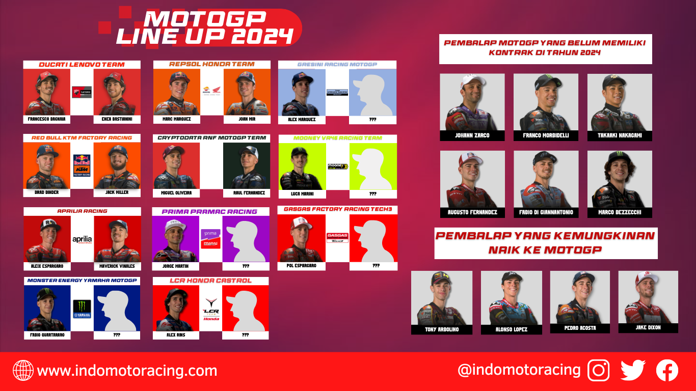 Untuk lebih jelasnya Indomotoracing akan coba membahasnya satu persatu. Bahasan akan dimulai dari team yang sudah komplit, diantaranya adalah Ducati Lenovo team, team merah ini sudah memiliki 2 pembalap yang akan tetap berada dimusim 2024 yaitu Francesco Bagnaina dan Enea Bastianini. Meskipun seperti yang kita ketahui Enea Bastianini belum bisa mengeluarkan potensinya akibat cidera bahu yang dialaminya, namun pihak Ducati yakin bahwa seiring berjalannya waktu dan adanya 5 minggu libur musim panas ini, dimana semua pembalap akan kembali dari nol, maka dipastikan Enea Bastianini akan tampil kembali dengan performa sebenarnya.