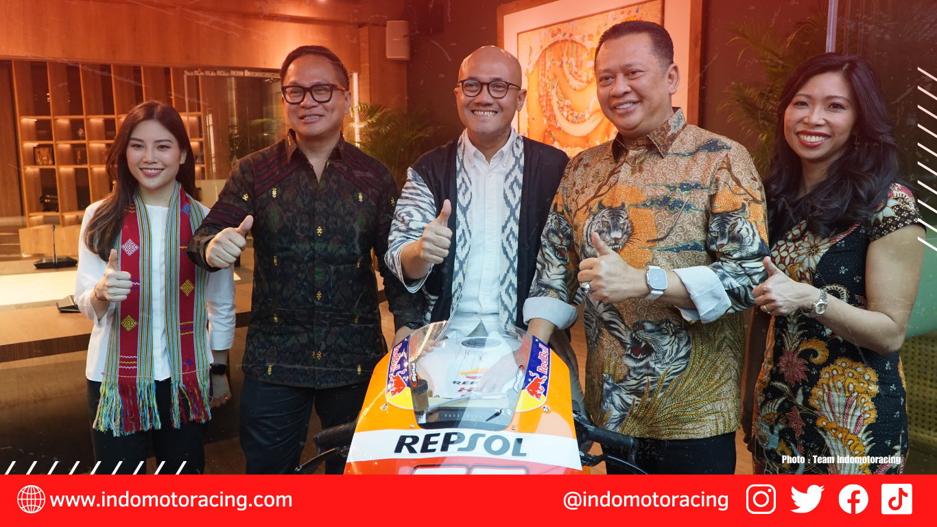 Press Conference Indonesian GP 2023 dihadiri oleh narasumber Wakil Menteri BUMN Kartika Wirjoatmodjo, Wakil Menteri Menteri Pariwisata dan Ekonomi Kreatif Angela Tanoesoedibjo, Ketua Umum IMI Bambang Soesatyo, Direktur Pemasaran dan Program Pariwisata InJourney Maya Watono dan Direktur Utama ITDC Ari Respati.
